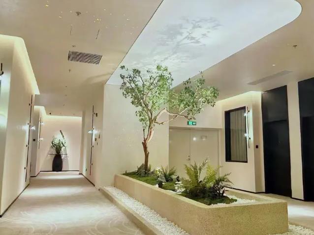 侘寂美學(xué)與現(xiàn)代簡(jiǎn)約融合,公區(qū)綠植、螢火蟲燈營(yíng)造靜謐藝術(shù)氛圍。