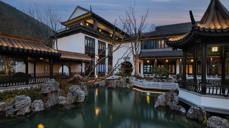 整個(gè)酒店被群山環(huán)繞,中式雅致宅院,門前潺潺溪流,溫柔江南庭院,小橋流水人家,亭臺(tái)樓閣,樹影婆娑~